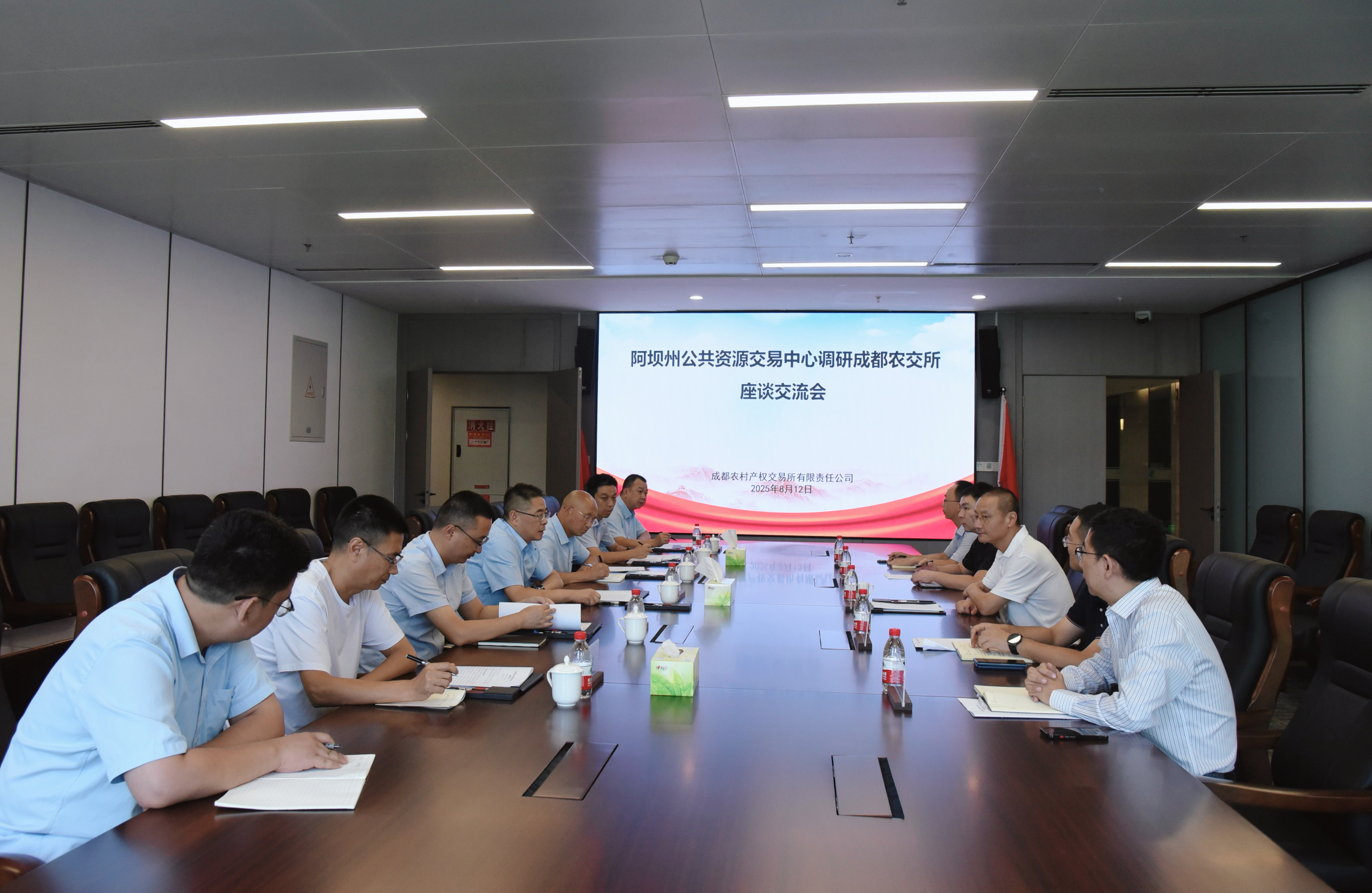 2025年8月12日下午,阿坝州公共资源交易中心主任袁翠军带队到成都农交所,调研农村产权交易工作做法和经验。阿坝州公共资源交易中心副主任甘立训、副主任李仲宏等参加调研。成都农交所党总支委员、副总经理吴伟及有关部门负责人参加调研座谈。