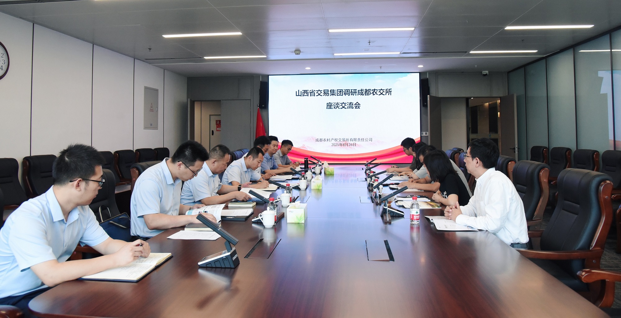 2025年8月26日下午,山西省交易集团党委副书记、副董事长、总经理王少飞莅临成都农交所调研。山西省交易集团党委委员、副总经理李文戈,张浩,集团总经理助理、山西省产权交易市场党支部书记、董事张兆阳等参加调研。成都农交所党总支书记、董事长徐达泉,党总支委员、副总经理杨静及有关部门负责人参加调研座谈。